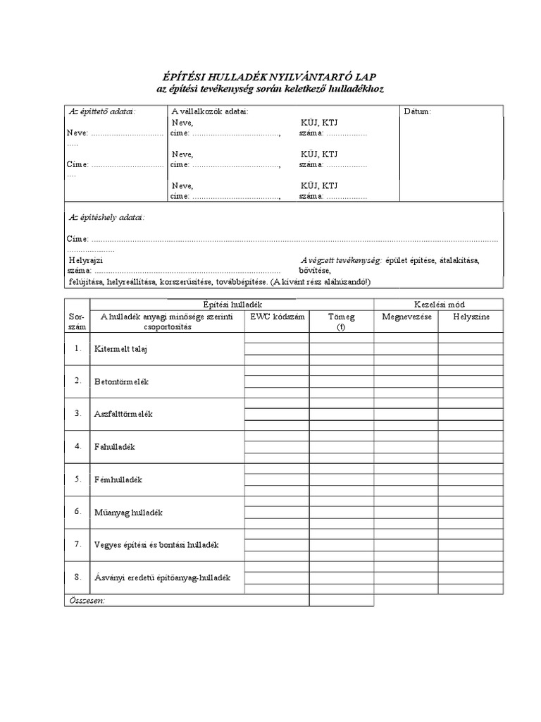 Epitesi Hulladek Nyilvantarto Lap