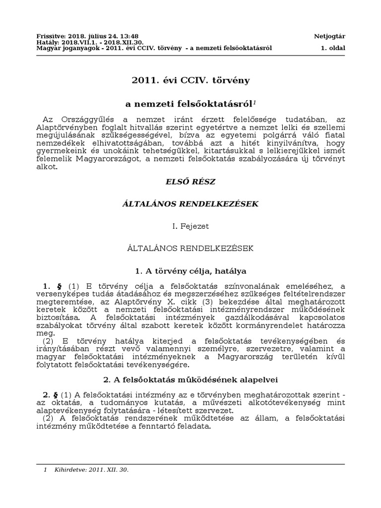 2011 Evi Cciv Torveny A Nemzeti Felsooktatasrol 1 Pdf Ingyenes Letoltes